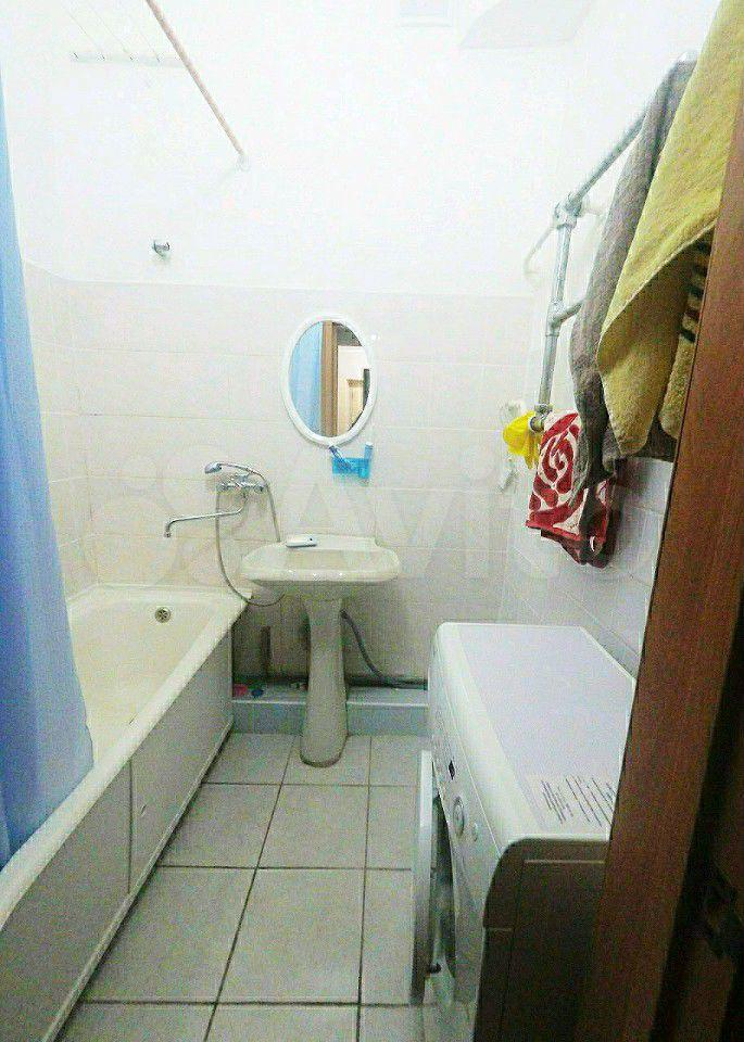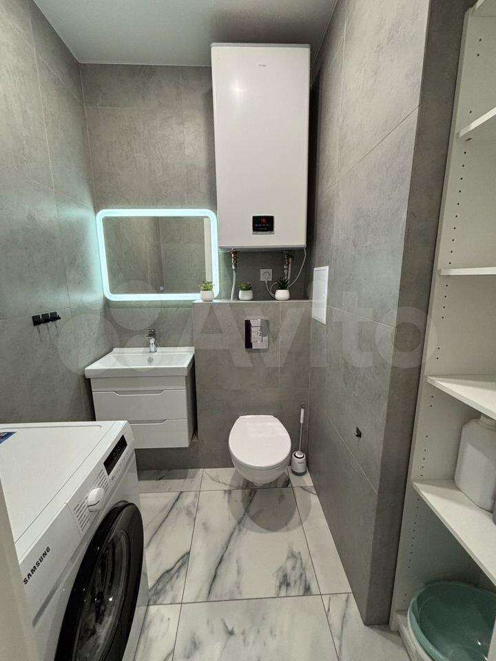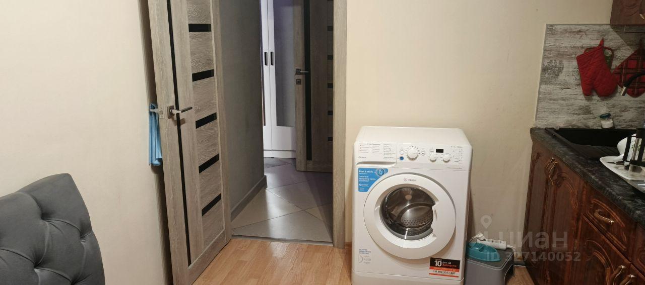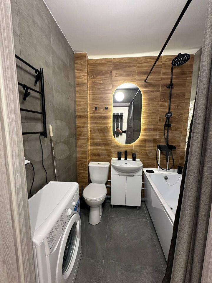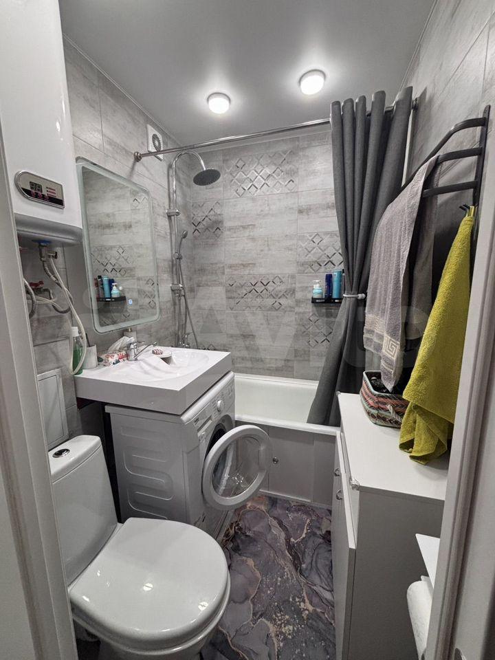 Кухня оборудована плитой и вытяжкой. В комнате установлен вместительный шкаф для хранения вещей. Санузел совмещённый, оформлен в светлых тонах, оснащён ванной и стиральной машиной.