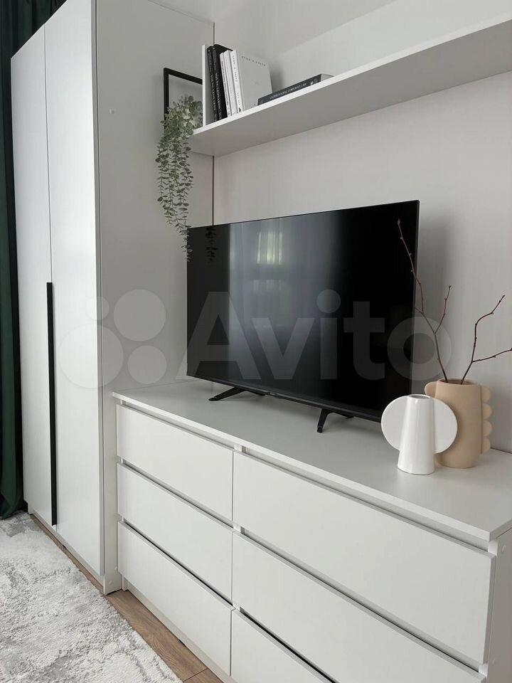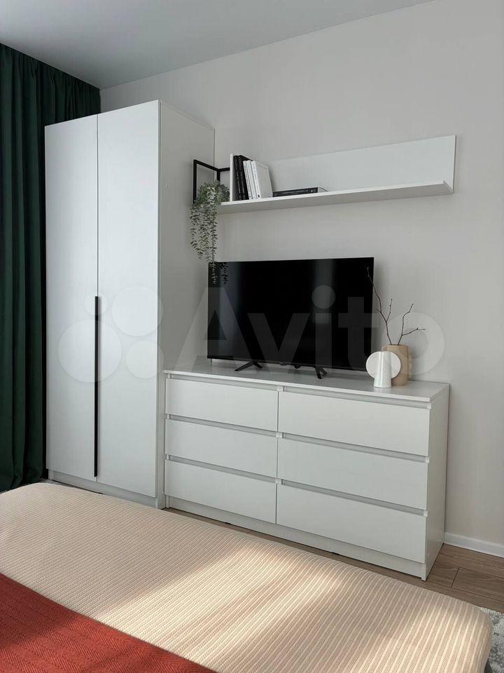 Уютная однокомнатная квартира, в комнате большой шкаф, удобная кровать с ортопедическим матрасом, комод, прикроватные тумбы и телевизор.