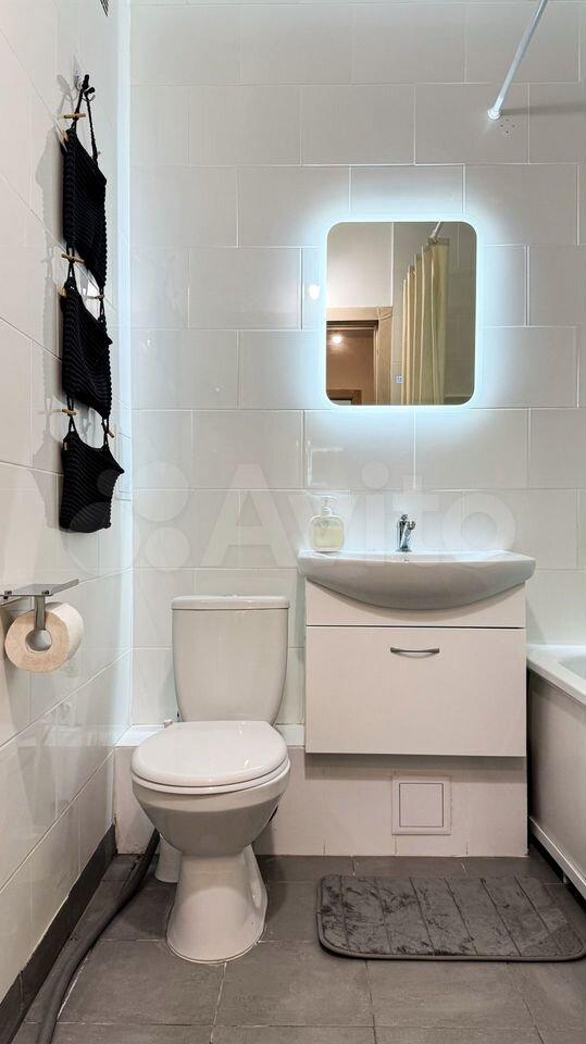 Кухня оборудована плитой и вытяжкой. В комнате установлен вместительный шкаф для хранения вещей. Санузел совмещённый, оформлен в светлых тонах, оснащён ванной и стиральной машиной.