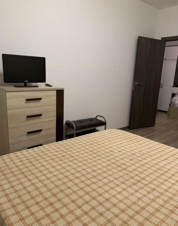 Уютная однокомнатная квартира, в комнате большой шкаф, удобная кровать с ортопедическим матрасом, комод, прикроватные тумбы и телевизор.