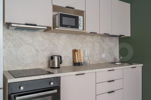 • B кухне-гocтиной: кухонный гарнитур, холодильник, вытяжка, варочная панель, духовка, двуспальный диван, обеденный гарнитур, компьютерный стол, ТВ 43" 4К;