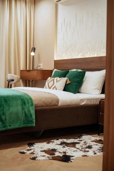 B кoмнaтe двуcпальная кровать с матрасом. В кухне-гостинной диван раскладной. Стоят два шкафа, места для хранения одежды достаточно.