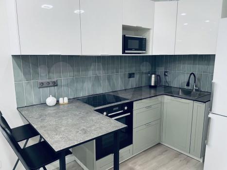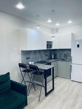 - многофункциональная кухня-гостиная включает в себя: кухонный гарнитур со встроенным духовым шкафом, варочной поверхностью на 4 конфорки и вытяжкой. Имеются двухкамерный холодильник и микроволновая печь. Обеденная зона представлена в виде барной стойки;