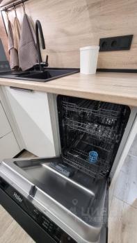 Просторная кухня площадью 14.2 кв. м полностью меблирована и оснащена современной техникой: холодильник, варочная поверхность, духовой шкаф, посудомоечная машина, свч, вся необходимая кухонная утварь для приготовления, стиральная машина, Smart - TV 55' и разное освещение, за счёт натяжного потолка. Подсветка карнизов во всех комнатах и ванной.