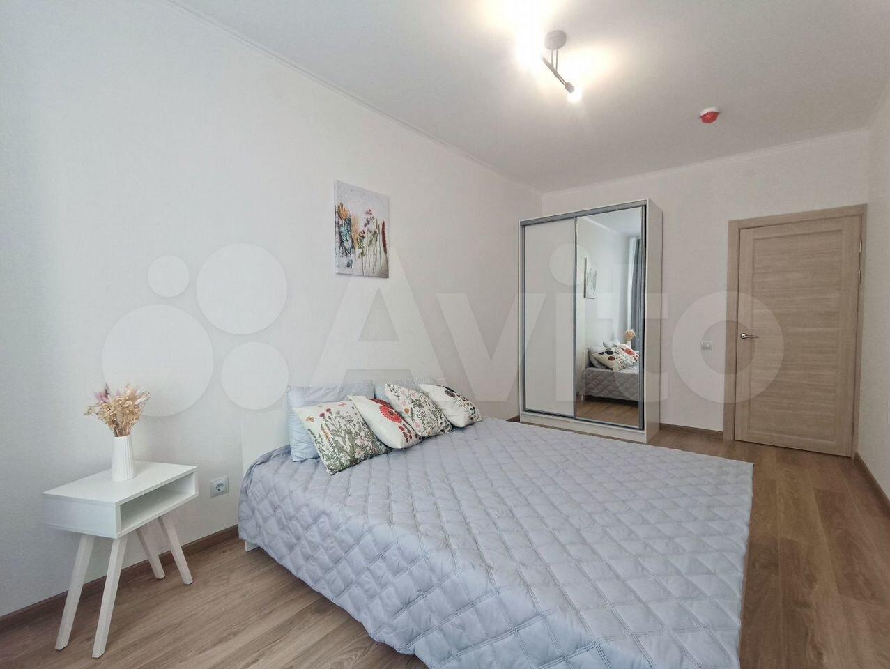 В квартире сделан ремонт. В ванной душ с термостатом. Есть вся необходимая бытовая техника (телевизор 65” с ТВ приставкой, посудомойка, стиралка, утюг и доска, чайник, пылесос, холодильник, плита, роутер, минимальный набор тарелок и столовых приборов). Из мебели: кровать с ортопедическим матрасом, кожаный диван (раскладывается, дополнительное спальное место), стулья, два шкафа, тумба, гарнитур. Телевизор крепится на кронштейн, это позволяет смотреть ТВ с дивана и кухни. В спальне шторы блэкаут.