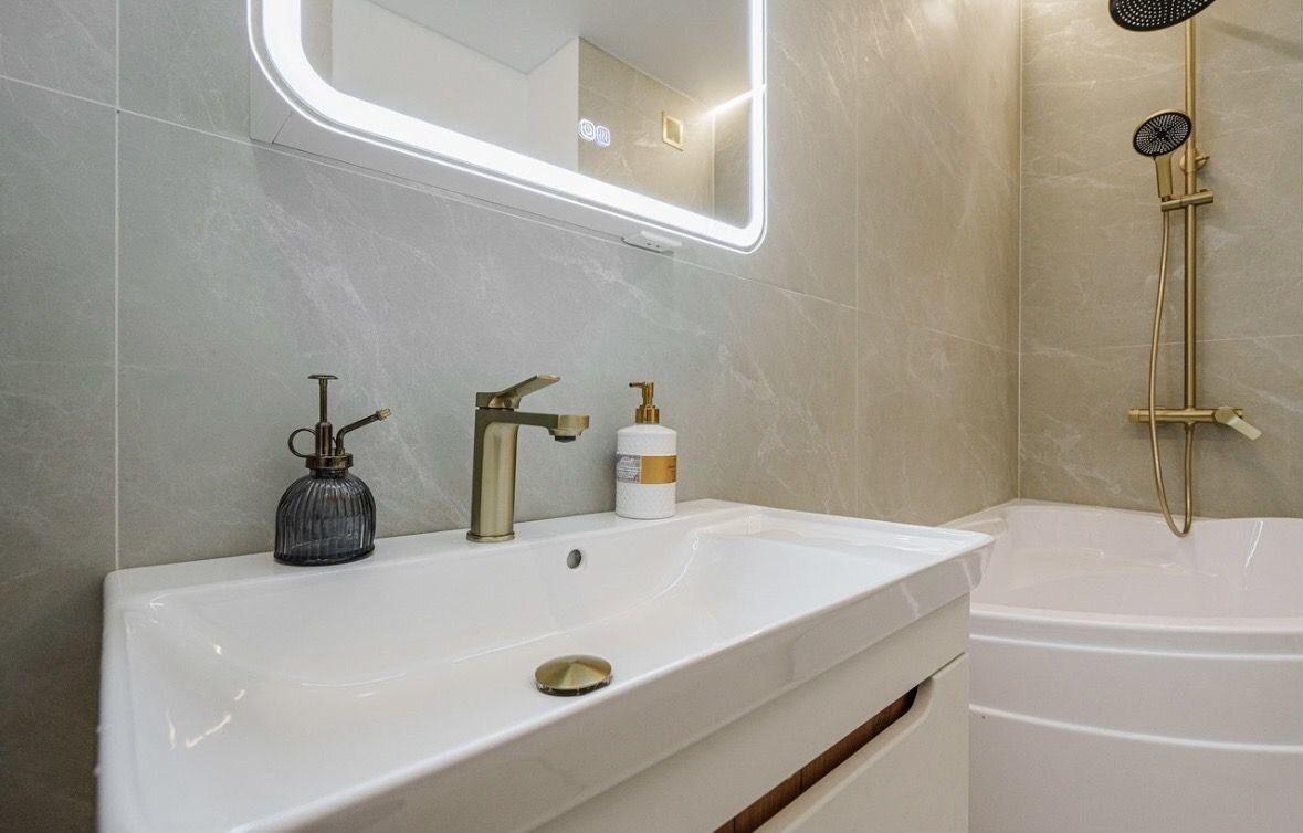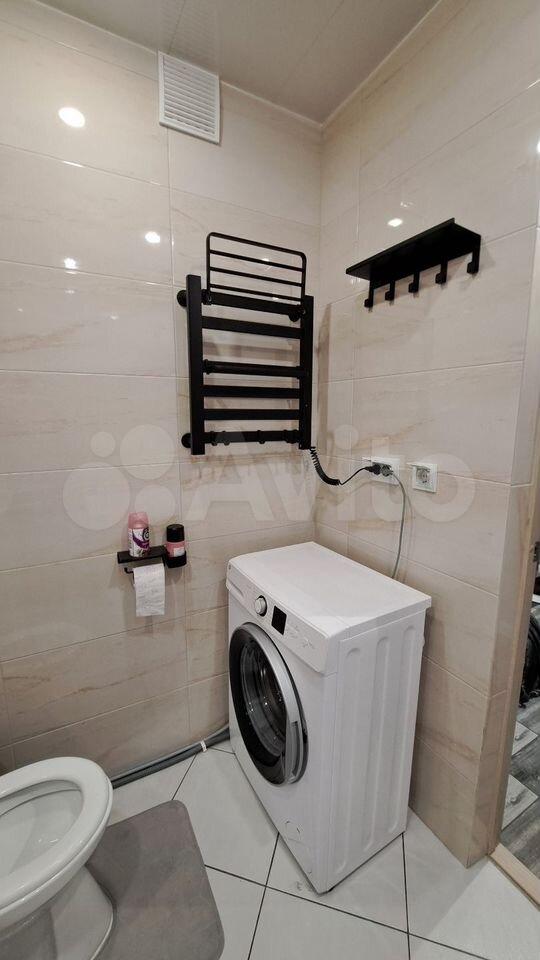 Ванная комната оборудована сантехникой, зеркалом с подсветкой, стиральной машинкой.