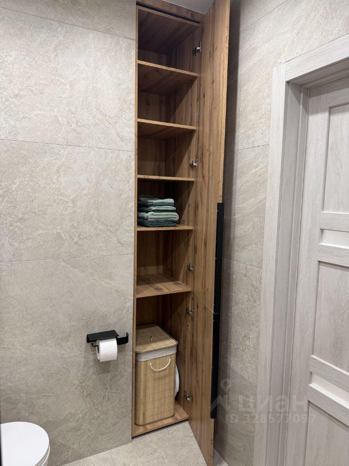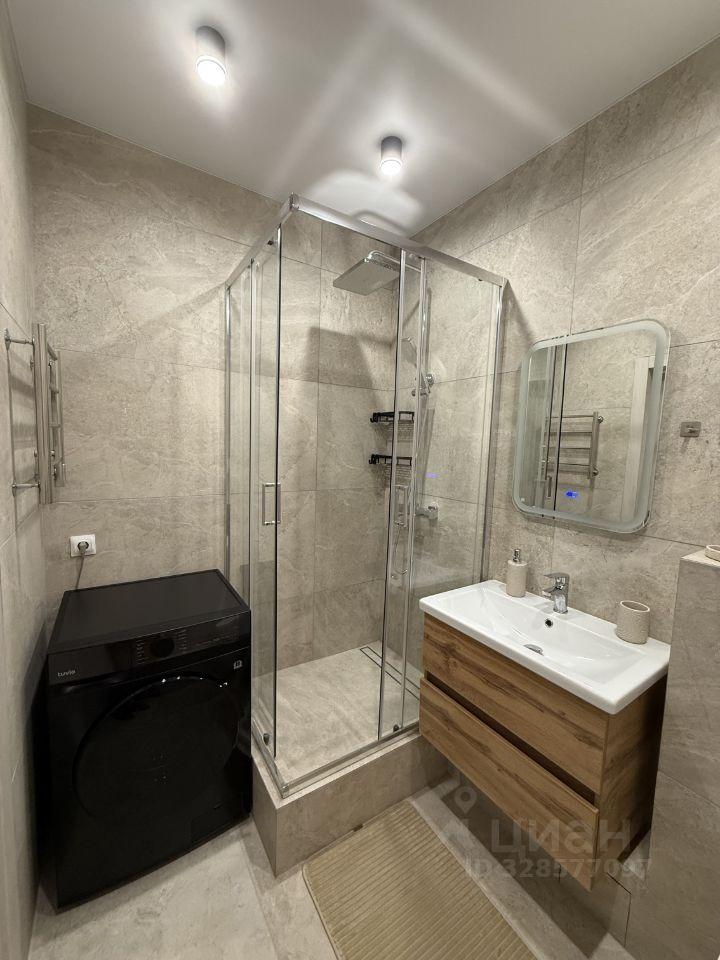 Санузел совмещенный. Оснащен душевой кабиной, широкой раковиной, встроенным шкафом и стирально-сушильной машиной.
