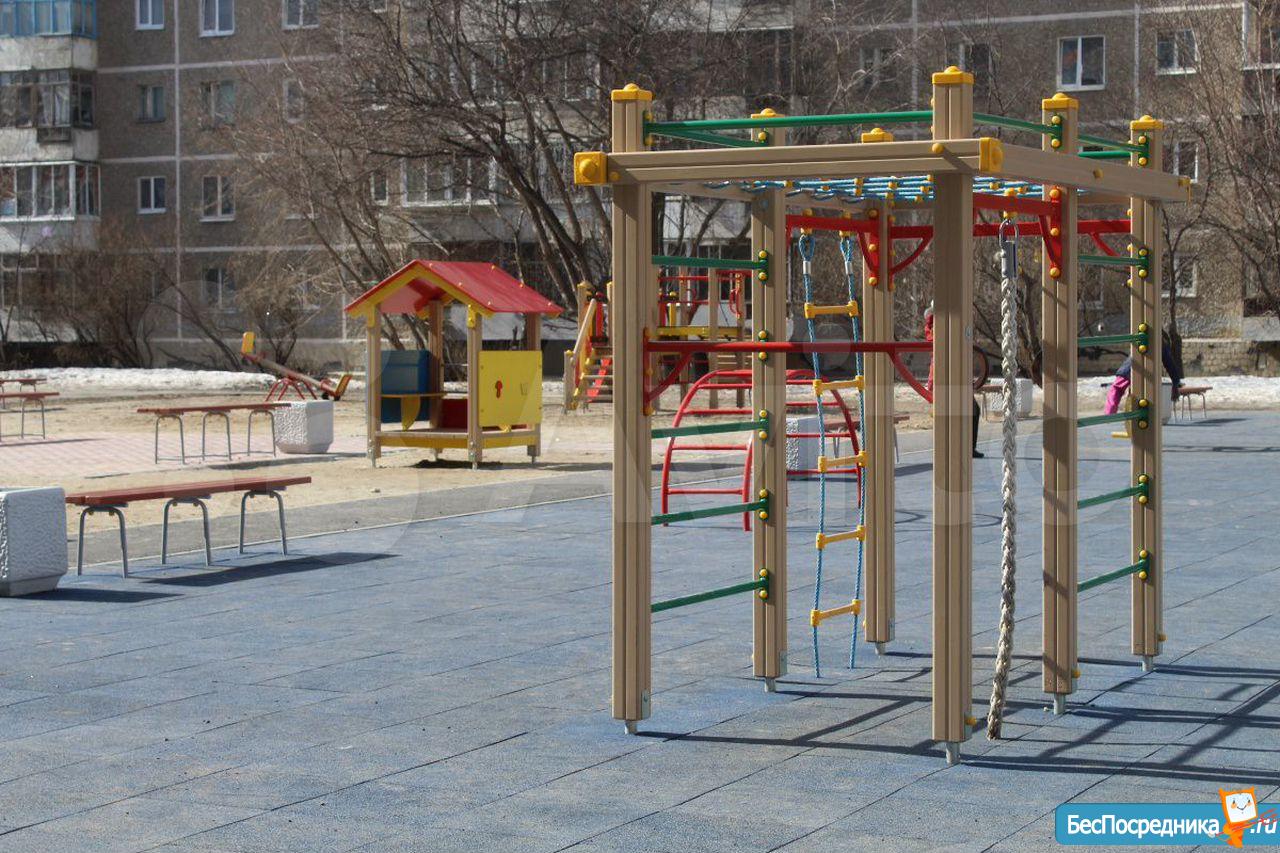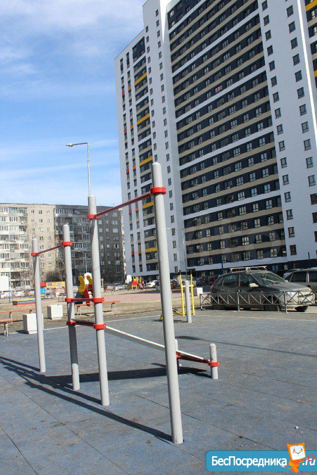 Закрытый двор, большая детская площадка, тренажёры.