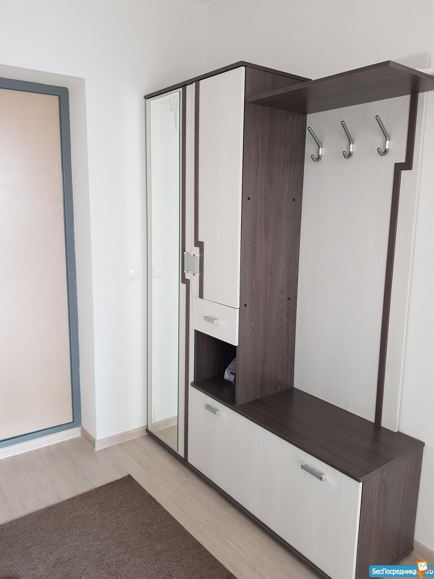 В квартире кровать 180*200 с очень удобным матрасом, диван огромный и мягкий, кухонный гарнитур с варочной поверхностью, холодильник и стиральная машина. В прихожей разместился вещевой шкаф Икея, вешалка для верхней одежды.