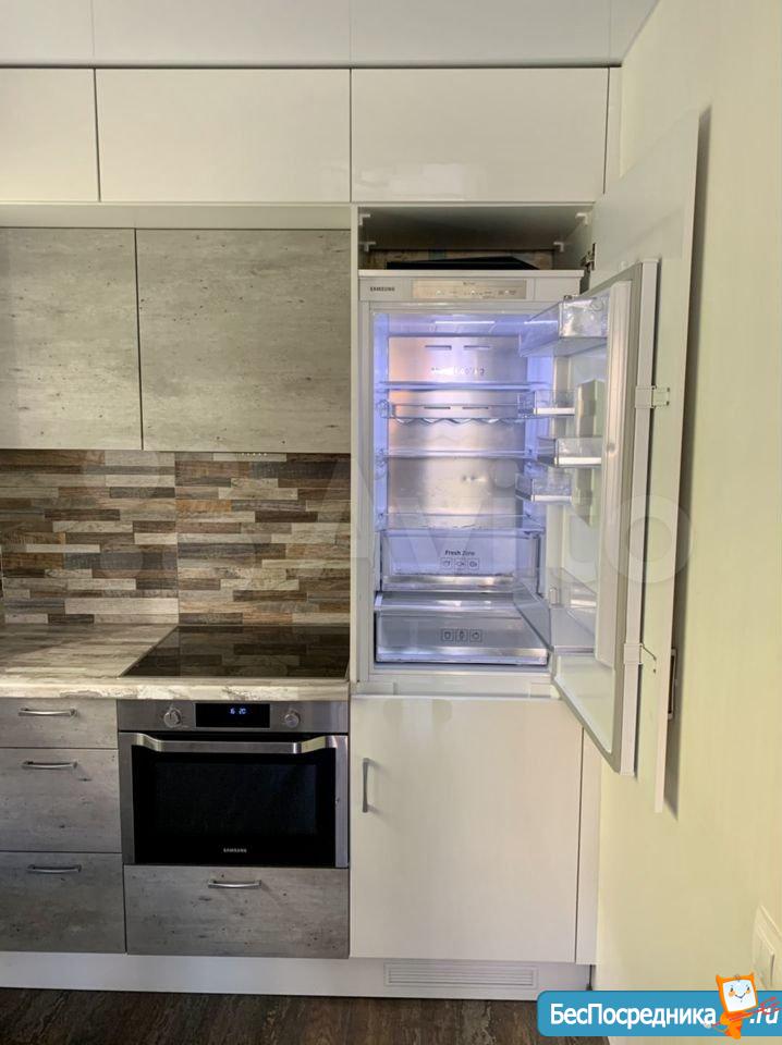 Кухня, совмещенная с гостиной: огромный раскладывающийся диван, встроенные шкафы, рабочее место, кухонный гарнитур со встроенным холодильником и морозилкой, духовкой, варочной поверхностью, посудомойкой, раковина напротив окна, обеденный стол и стулья.