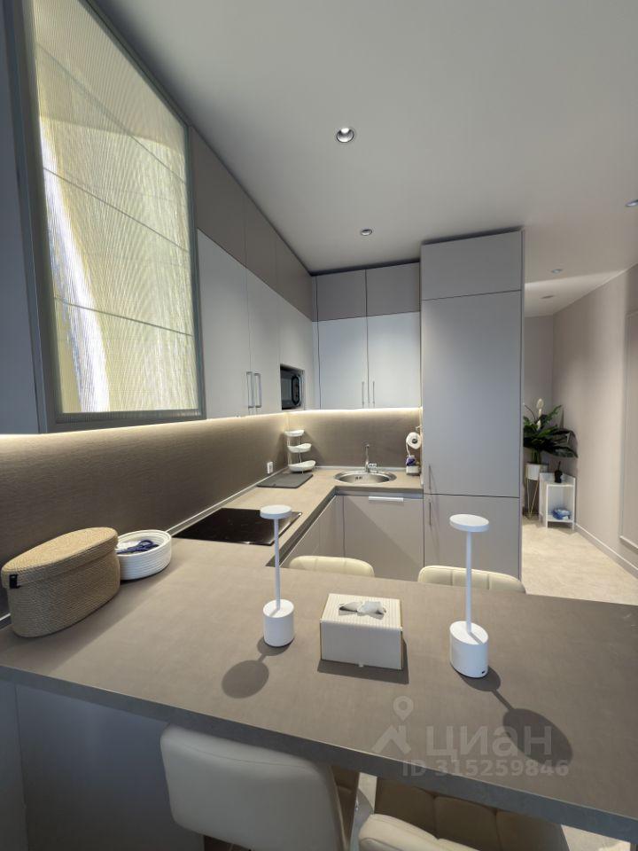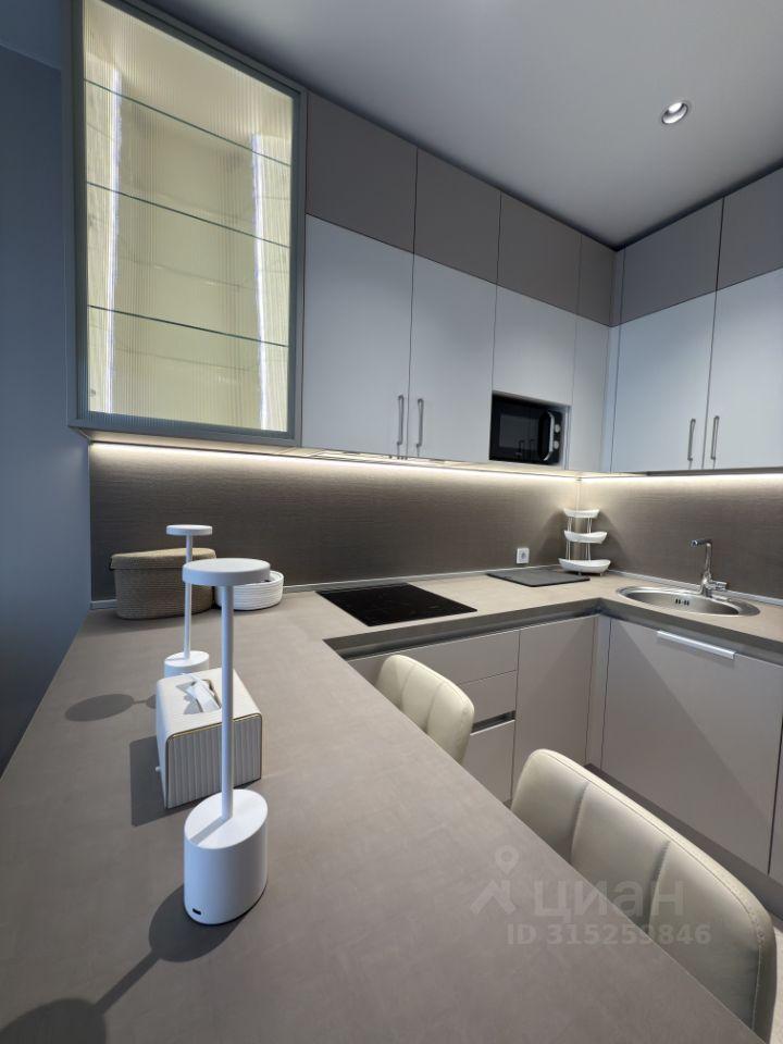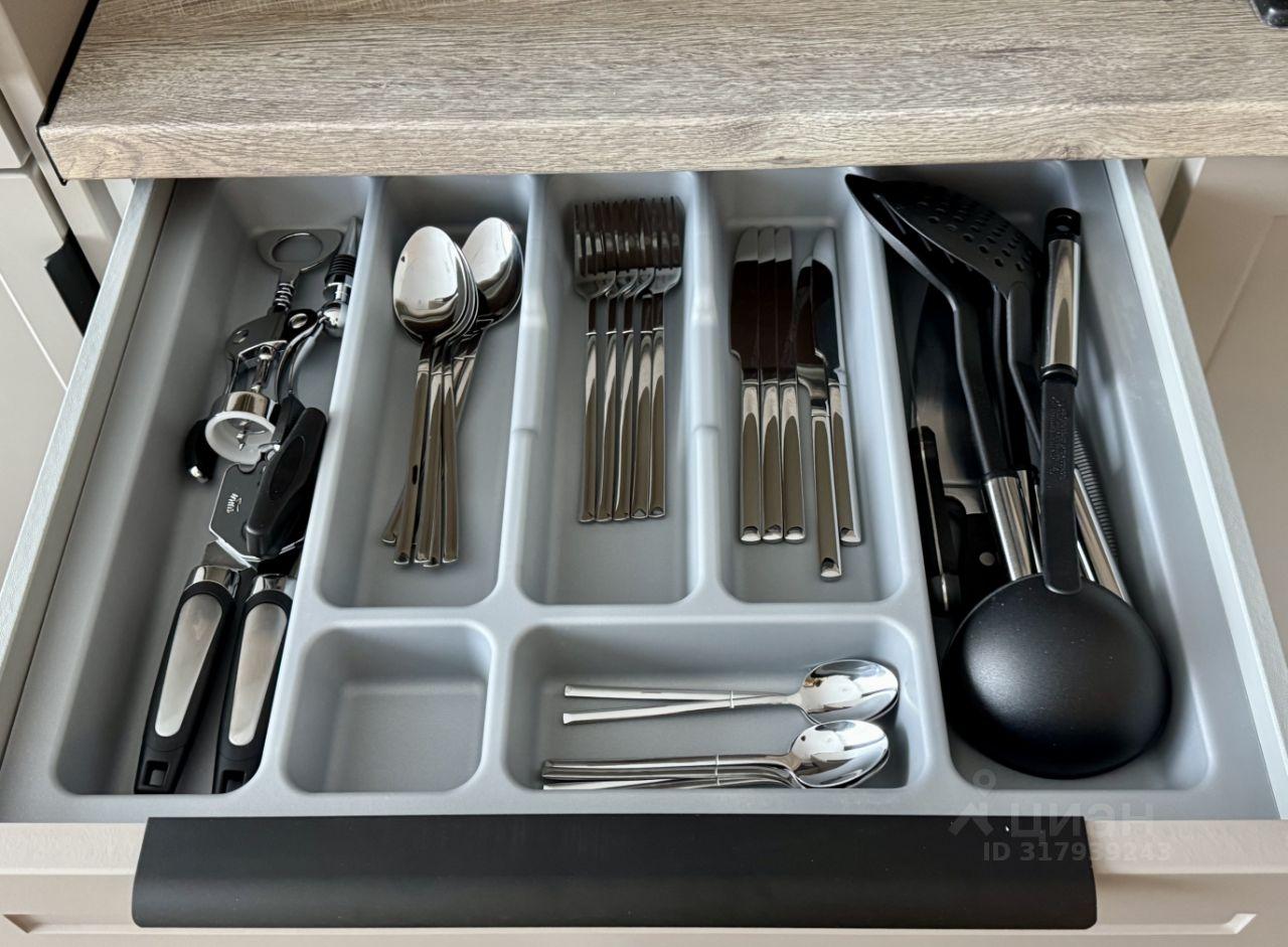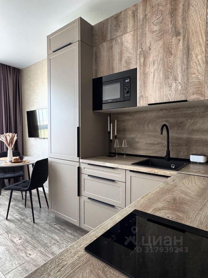 Кухонная зона оборудована встроенным холодильником, микроволновкой, индукционной варочной поверхностью и духовым шкафом с конвекцией, чайником. В шкафах новая посуда и столовые приборы
