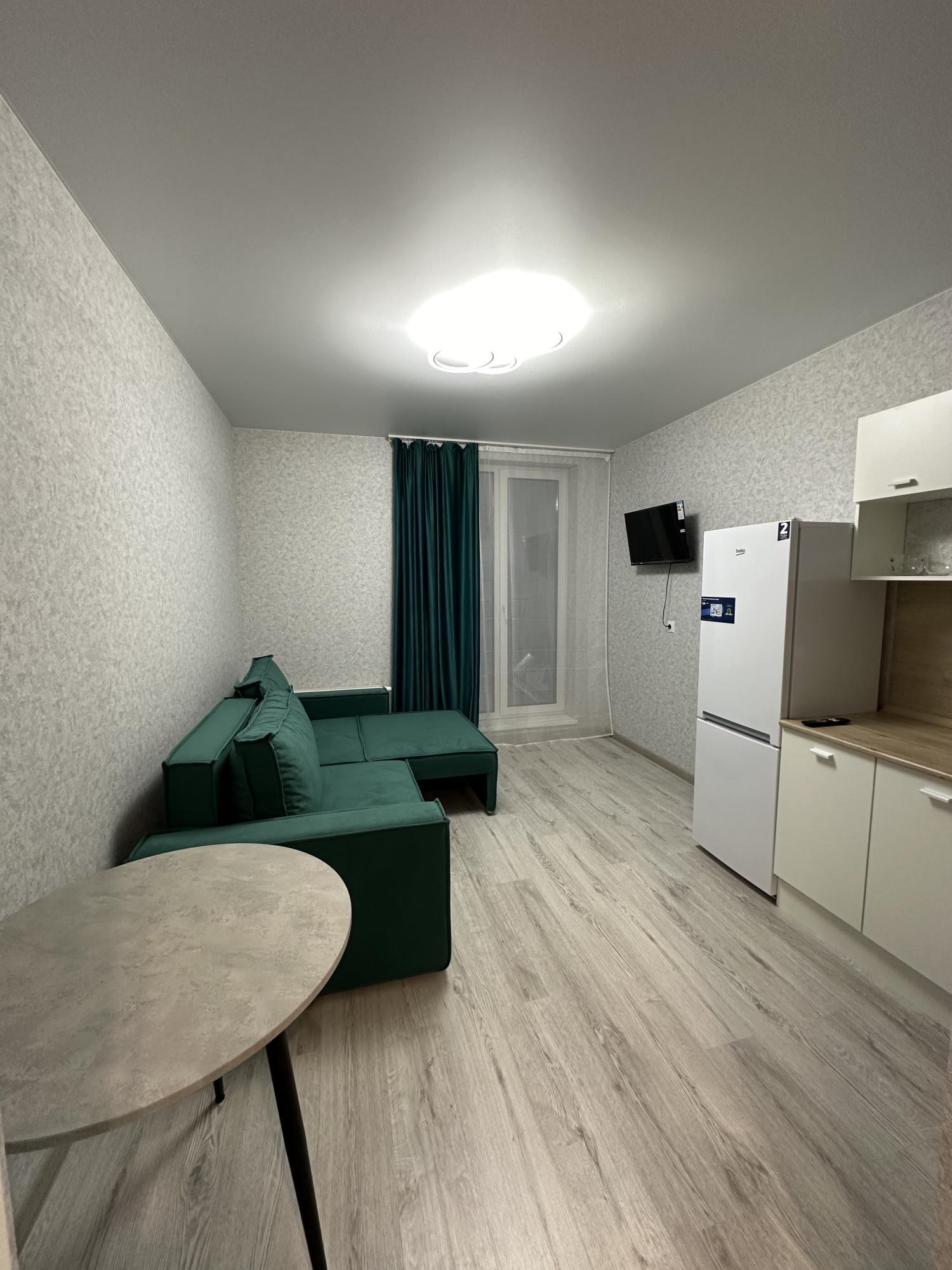 В квартире есть все для проживания: диван, прихожая, кухонный гарнитур, стол, холодильник, чайник, стиральная машинка, телевизор, плита, душевая, в скором времени довезем стулья, будет установлен домофон с видео наблюдением. Вид из окна выходит во двор. В доме 2 лифта, закрытый благоустроенный эко -двор оснащен системой видеонаблюдения и круглосуточной охраной. Вход на территорию осуществляется по системе электронных пропусков. Внутренний двор оборудован современными детскими площадками, и также местам для отдыха взрослых. Во входных группах предусмотрено помещение для хранения детских колясок, велосипедов и самокатов . Есть парковка.