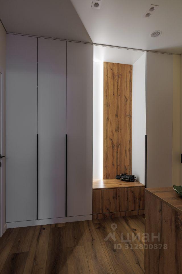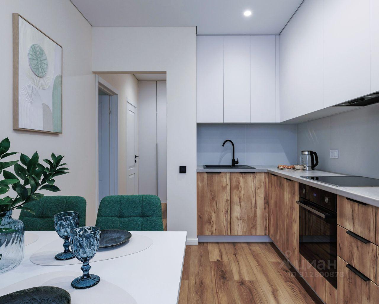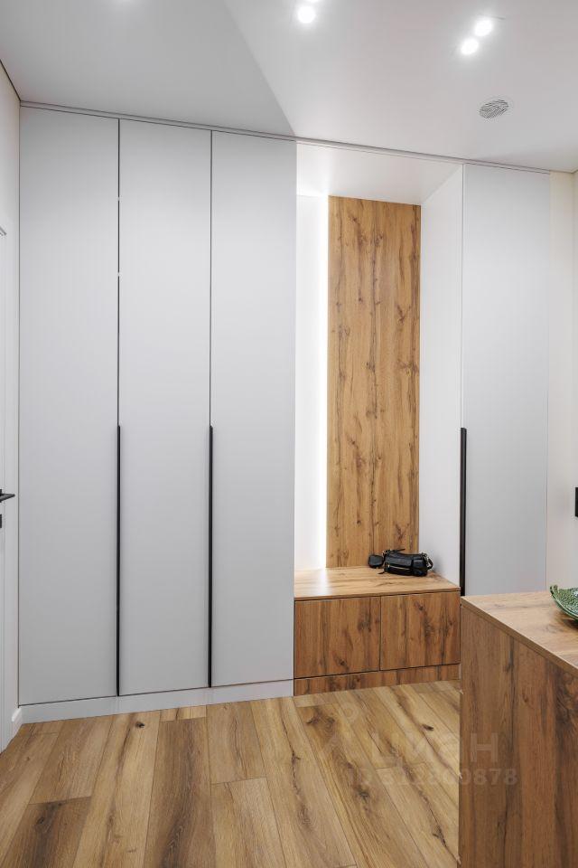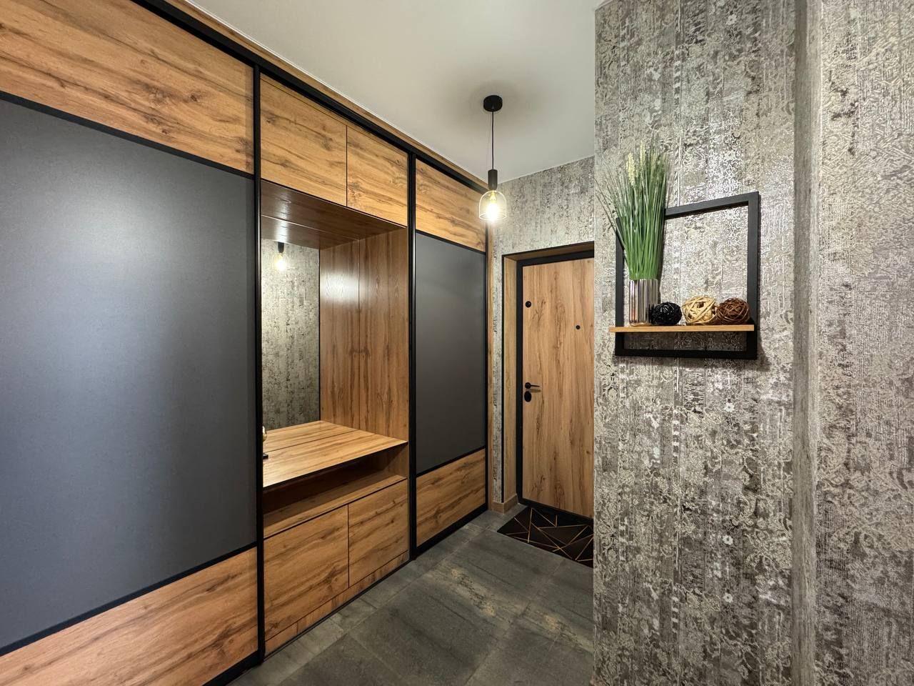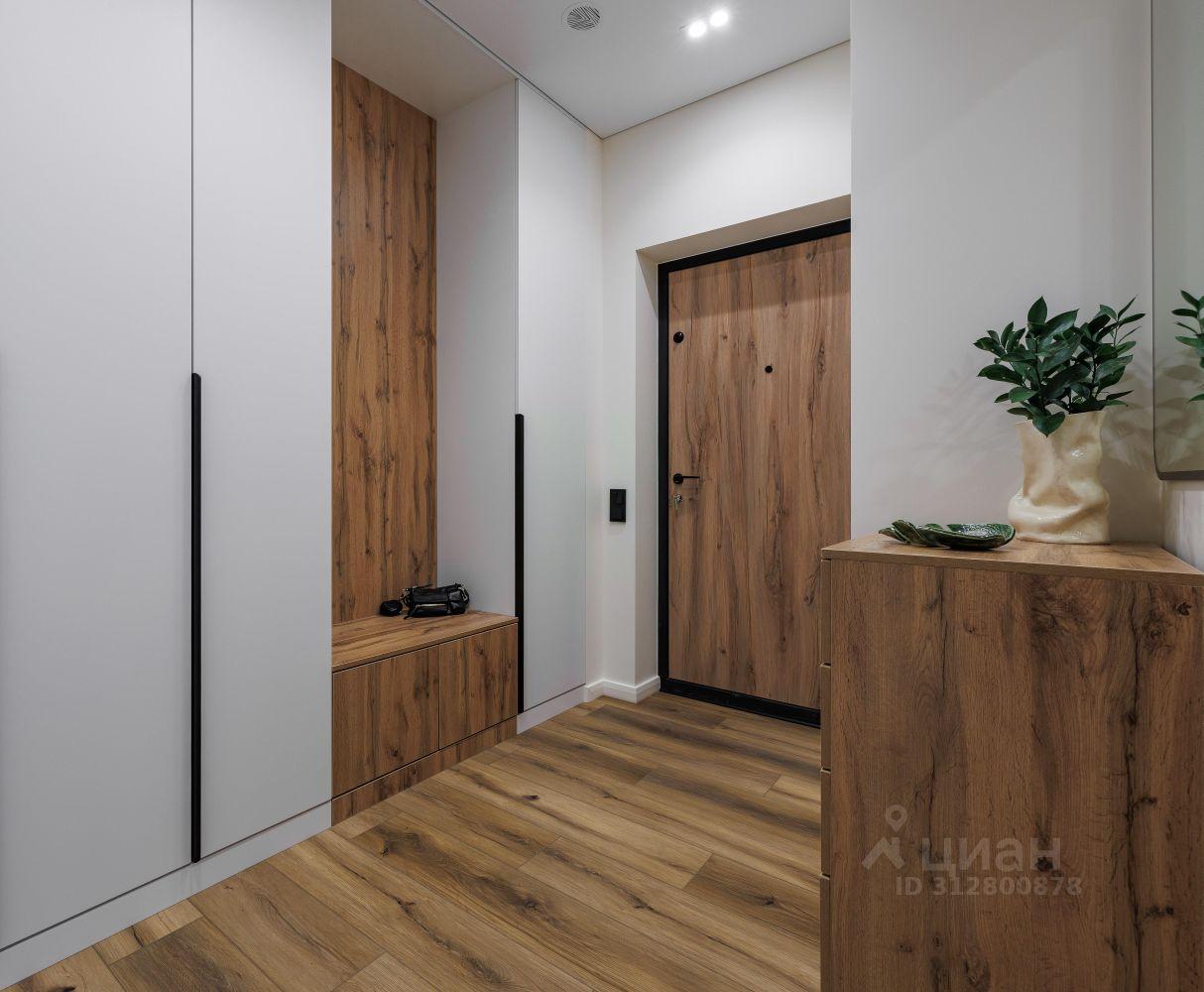 Дизайнерский ремонт выполнен в современном стиле, сочетающем светлые тона с элементами натурального дерева. В отделке использованы качественные материалы: полы с текстурой дерева, стильная кухня с матовыми фасадами, продуманное освещение, создающее уютную атмосферу.