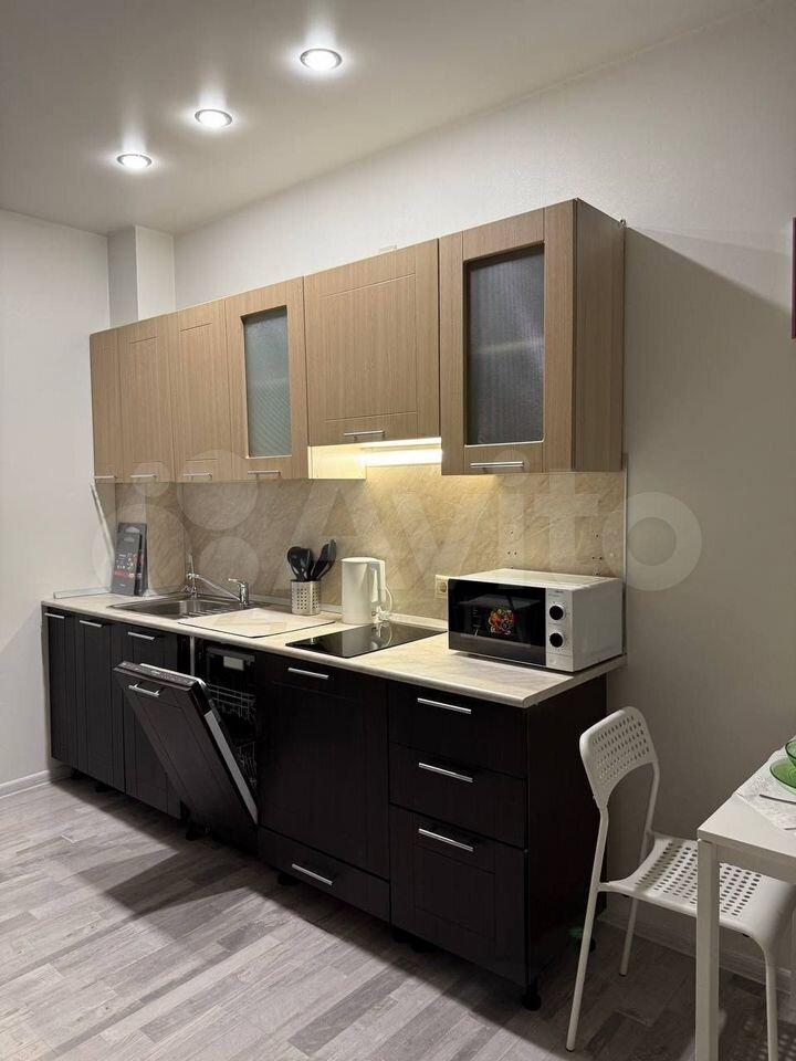 - Кухонным гарнитуром с техникой: стеклокерамическая плита, СВЧ-печь, чайник, холодильник, посудомоечная машина, аэрогриль. Также имеется новая посуда, столовые приборы на 4 персоны и многое другое.