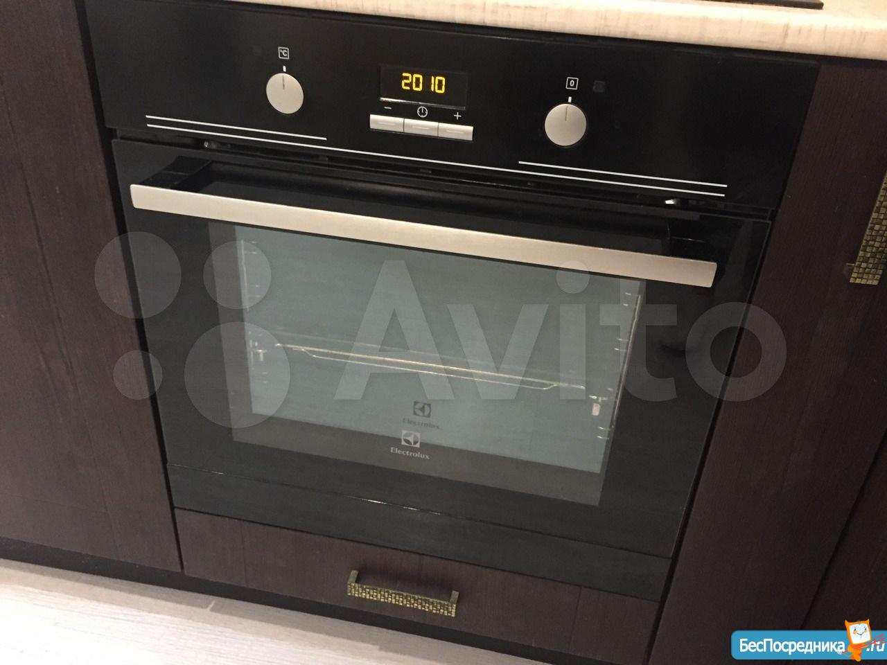 На кухне из мебели: встроенная кухня, диван, новый стол и стулья, комод, также есть минимальный набор посуды.