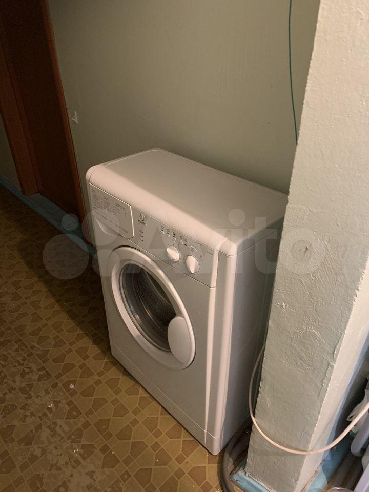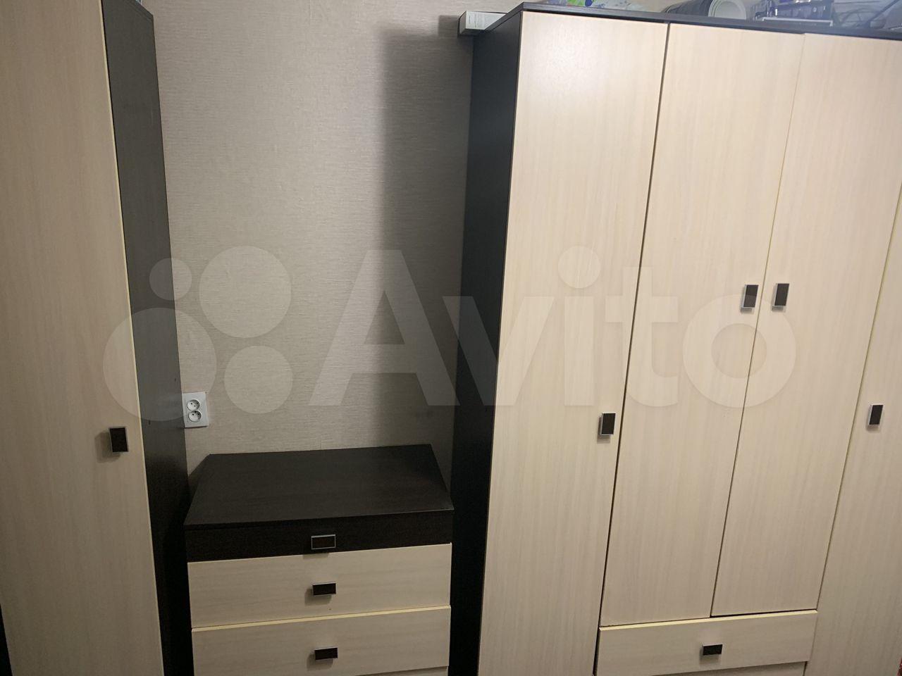 В комнате: диван, шкаф для одежды с зеркалом, комод, шкаф для посуды, полка, стиральная машина, холодильник, микроволновая печь, электро чайник, сушилка для белья.