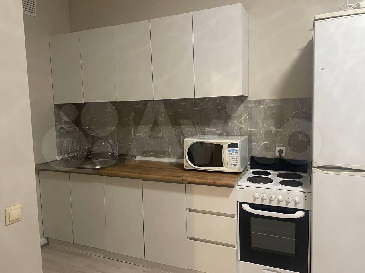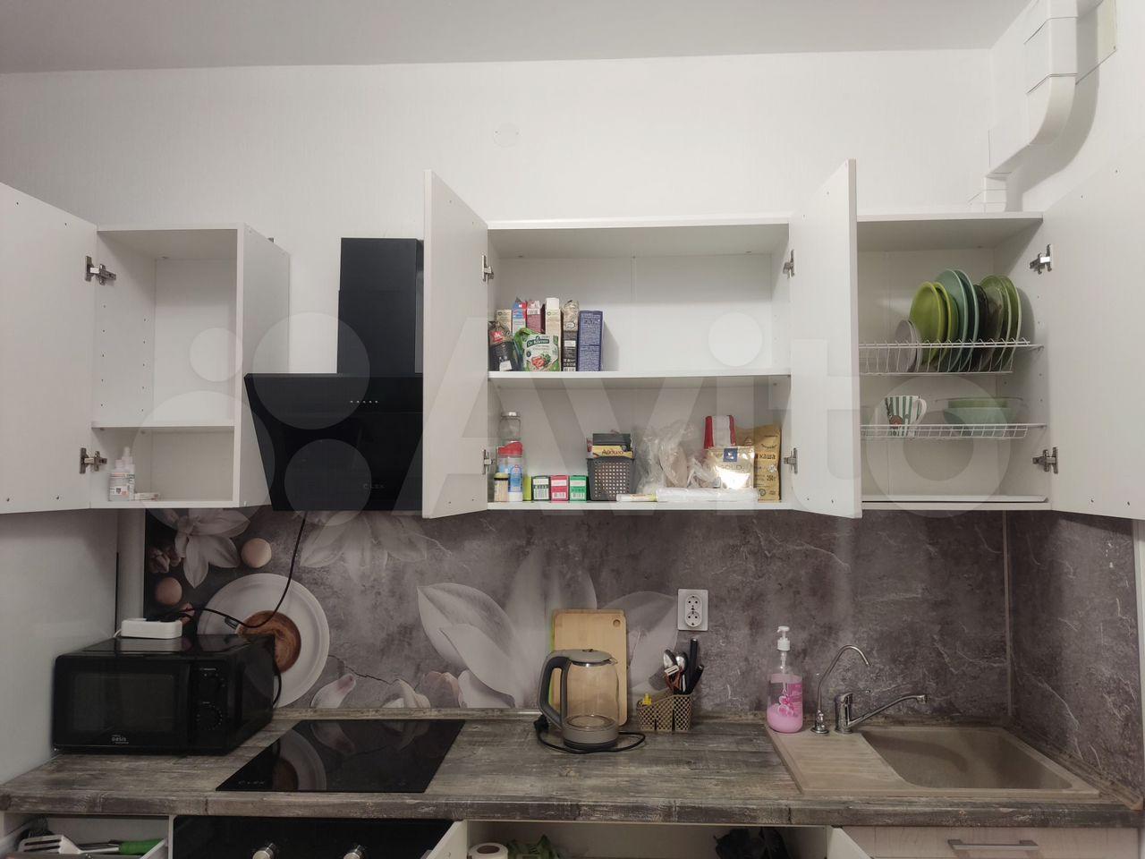 - Кухонный гаpнитур с бaзовым набором посуды (тарелки, кружки, столовые приборы, одна небольшая кастрюля и блинная сковорода)
