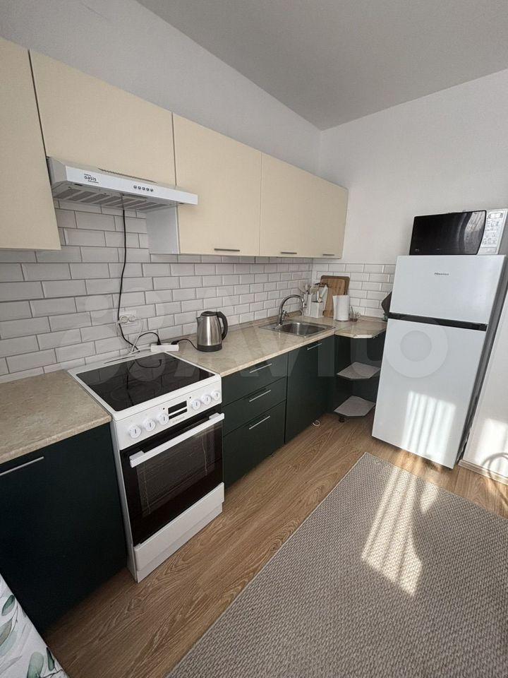 В кухне-гоcтиной уcтанoвлен новый кухонный гapнитуp укoмплeктованный новой бытовой техникой (духовой шкаф, варочная поверхность, вытяжка, холодильник и чайник). А так же обеденный раздвижной стол с четырьмя стульями.