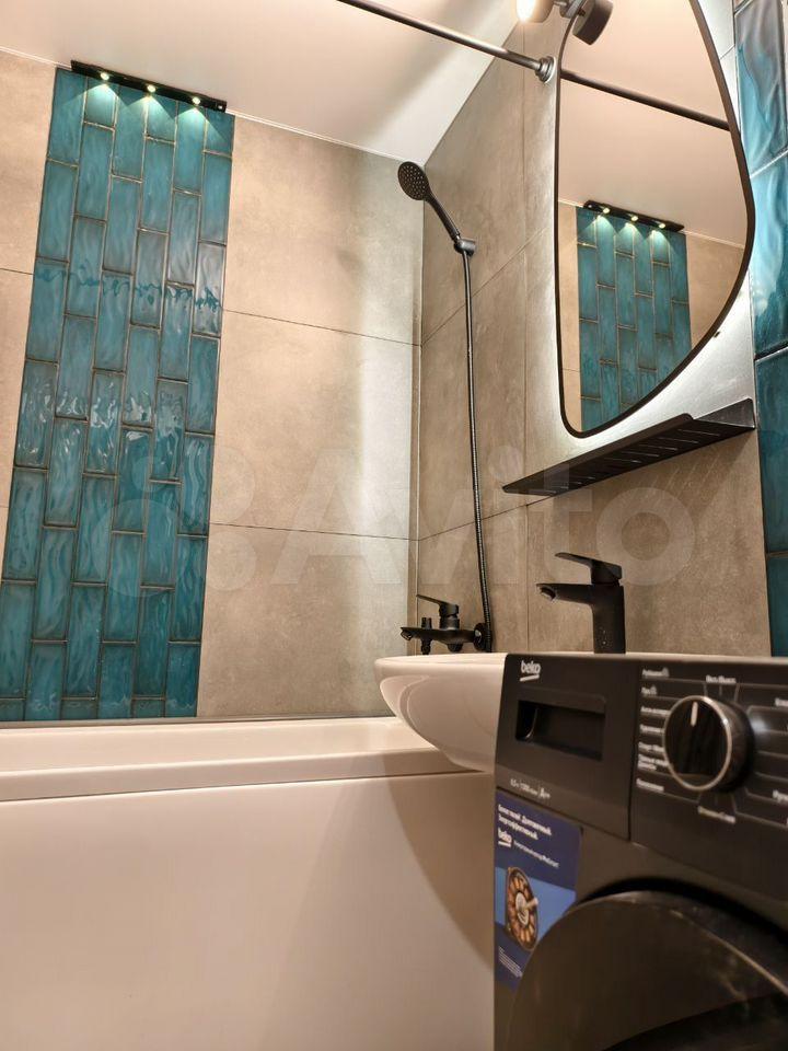 Ванная: стиральная машина, душевая зона, прямо как в гостинице, большое зеркало.