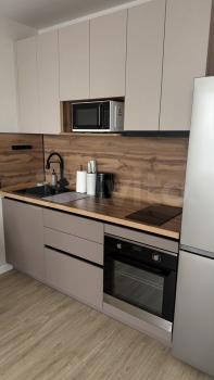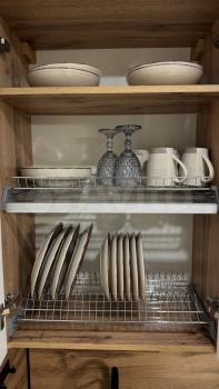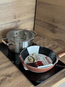 Хороший, дорогой кухонный гарнитур - выполнен на заказ, также помимо основной техники имеется микроволновка, эл.чайник, установлена система фильтрации воды барьер, набор столовой посуды, приборы, сковорода и кострюля для индукционной плиты